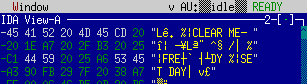 This is a screenshot of the same database but in this case IDA is using the native X11 TVision library and opening its own window. Notice the differences in the window border (now a double-thick line), the window minimize button (now an up arrow), the scroll bar arrow (now an up triangle) and the status display (down arrow and a gradually shaded outline). Also notice how the character representation of the hexdump display has improved slightly. Some characters that were previously interpolated to display in the terminal window are now fully visible and distinguishable in the native window. |